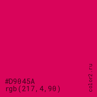 Цвет #D9045A в цветовой модели RGB обозначается тремя октетами (217, 4, 90) в десятичном формате и #D9045A в шестнадцатиричном (hex) формате, которые являются интенсивностью красного 217 (hex D9), интенсивность зелёного 4 (hex 04) и интенсивность синего 90 (hex 5A).