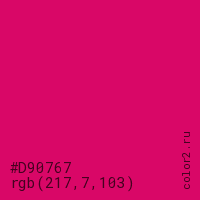 Цвет #D90767 в цветовой модели RGB обозначается тремя октетами (217, 7, 103) в десятичном формате и #D90767 в шестнадцатиричном (hex) формате, которые являются интенсивностью красного 217 (hex D9), интенсивность зелёного 7 (hex 07) и интенсивность синего 103 (hex 67).