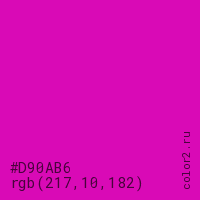 Цвет #D90AB6 в цветовой модели RGB обозначается тремя октетами (217, 10, 182) в десятичном формате и #D90AB6 в шестнадцатиричном (hex) формате, которые являются интенсивностью красного 217 (hex D9), интенсивность зелёного 10 (hex 0A) и интенсивность синего 182 (hex B6).