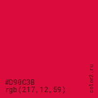 Цвет #D90C3B в цветовой модели RGB обозначается тремя октетами (217, 12, 59) в десятичном формате и #D90C3B в шестнадцатиричном (hex) формате, которые являются интенсивностью красного 217 (hex D9), интенсивность зелёного 12 (hex 0C) и интенсивность синего 59 (hex 3B).
