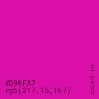 Цвет #D90FA7 в цветовой модели RGB обозначается тремя октетами (217, 15, 167) в десятичном формате и #D90FA7 в шестнадцатиричном (hex) формате, которые являются интенсивностью красного 217 (hex D9), интенсивность зелёного 15 (hex 0F) и интенсивность синего 167 (hex A7).