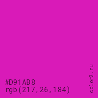 Цвет #D91AB8 в цветовой модели RGB обозначается тремя октетами (217, 26, 184) в десятичном формате и #D91AB8 в шестнадцатиричном (hex) формате, которые являются интенсивностью красного 217 (hex D9), интенсивность зелёного 26 (hex 1A) и интенсивность синего 184 (hex B8).
