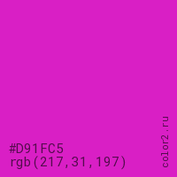 Цвет #D91FC5 в цветовой модели RGB обозначается тремя октетами (217, 31, 197) в десятичном формате и #D91FC5 в шестнадцатиричном (hex) формате, которые являются интенсивностью красного 217 (hex D9), интенсивность зелёного 31 (hex 1F) и интенсивность синего 197 (hex C5).