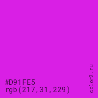 Цвет #D91FE5 в цветовой модели RGB обозначается тремя октетами (217, 31, 229) в десятичном формате и #D91FE5 в шестнадцатиричном (hex) формате, которые являются интенсивностью красного 217 (hex D9), интенсивность зелёного 31 (hex 1F) и интенсивность синего 229 (hex E5).