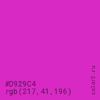 Цвет #D929C4 в цветовой модели RGB обозначается тремя октетами (217, 41, 196) в десятичном формате и #D929C4 в шестнадцатиричном (hex) формате, которые являются интенсивностью красного 217 (hex D9), интенсивность зелёного 41 (hex 29) и интенсивность синего 196 (hex C4).