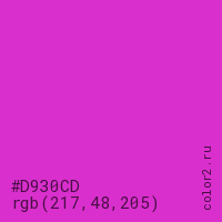 Цвет #D930CD в цветовой модели RGB обозначается тремя октетами (217, 48, 205) в десятичном формате и #D930CD в шестнадцатиричном (hex) формате, которые являются интенсивностью красного 217 (hex D9), интенсивность зелёного 48 (hex 30) и интенсивность синего 205 (hex CD).