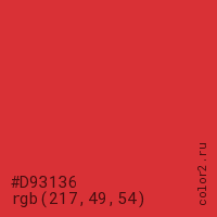 Цвет #D93136 в цветовой модели RGB обозначается тремя октетами (217, 49, 54) в десятичном формате и #D93136 в шестнадцатиричном (hex) формате, которые являются интенсивностью красного 217 (hex D9), интенсивность зелёного 49 (hex 31) и интенсивность синего 54 (hex 36).