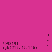 Цвет #D93191 в цветовой модели RGB обозначается тремя октетами (217, 49, 145) в десятичном формате и #D93191 в шестнадцатиричном (hex) формате, которые являются интенсивностью красного 217 (hex D9), интенсивность зелёного 49 (hex 31) и интенсивность синего 145 (hex 91).