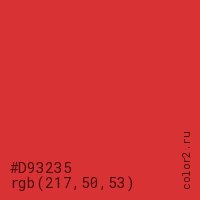 Цвет #D93235 в цветовой модели RGB обозначается тремя октетами (217, 50, 53) в десятичном формате и #D93235 в шестнадцатиричном (hex) формате, которые являются интенсивностью красного 217 (hex D9), интенсивность зелёного 50 (hex 32) и интенсивность синего 53 (hex 35).