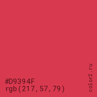 Цвет #D9394F в цветовой модели RGB обозначается тремя октетами (217, 57, 79) в десятичном формате и #D9394F в шестнадцатиричном (hex) формате, которые являются интенсивностью красного 217 (hex D9), интенсивность зелёного 57 (hex 39) и интенсивность синего 79 (hex 4F).