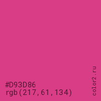 Цвет #D93D86 в цветовой модели RGB обозначается тремя октетами (217, 61, 134) в десятичном формате и #D93D86 в шестнадцатиричном (hex) формате, которые являются интенсивностью красного 217 (hex D9), интенсивность зелёного 61 (hex 3D) и интенсивность синего 134 (hex 86).