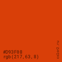 Цвет #D93F08 в цветовой модели RGB обозначается тремя октетами (217, 63, 8) в десятичном формате и #D93F08 в шестнадцатиричном (hex) формате, которые являются интенсивностью красного 217 (hex D9), интенсивность зелёного 63 (hex 3F) и интенсивность синего 8 (hex 08).