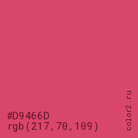 Цвет #D9466D в цветовой модели RGB обозначается тремя октетами (217, 70, 109) в десятичном формате и #D9466D в шестнадцатиричном (hex) формате, которые являются интенсивностью красного 217 (hex D9), интенсивность зелёного 70 (hex 46) и интенсивность синего 109 (hex 6D).