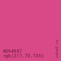 Цвет #D94987 в цветовой модели RGB обозначается тремя октетами (217, 73, 135) в десятичном формате и #D94987 в шестнадцатиричном (hex) формате, которые являются интенсивностью красного 217 (hex D9), интенсивность зелёного 73 (hex 49) и интенсивность синего 135 (hex 87).