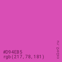 Цвет #D94EB5 в цветовой модели RGB обозначается тремя октетами (217, 78, 181) в десятичном формате и #D94EB5 в шестнадцатиричном (hex) формате, которые являются интенсивностью красного 217 (hex D9), интенсивность зелёного 78 (hex 4E) и интенсивность синего 181 (hex B5).