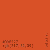 Цвет #D95227 в цветовой модели RGB обозначается тремя октетами (217, 82, 39) в десятичном формате и #D95227 в шестнадцатиричном (hex) формате, которые являются интенсивностью красного 217 (hex D9), интенсивность зелёного 82 (hex 52) и интенсивность синего 39 (hex 27).