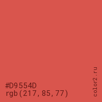 Цвет #D9554D в цветовой модели RGB обозначается тремя октетами (217, 85, 77) в десятичном формате и #D9554D в шестнадцатиричном (hex) формате, которые являются интенсивностью красного 217 (hex D9), интенсивность зелёного 85 (hex 55) и интенсивность синего 77 (hex 4D).