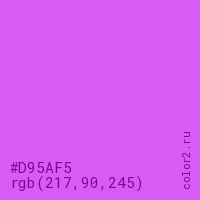 Цвет #D95AF5 в цветовой модели RGB обозначается тремя октетами (217, 90, 245) в десятичном формате и #D95AF5 в шестнадцатиричном (hex) формате, которые являются интенсивностью красного 217 (hex D9), интенсивность зелёного 90 (hex 5A) и интенсивность синего 245 (hex F5).