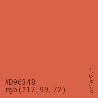 Цвет #D96348 в цветовой модели RGB обозначается тремя октетами (217, 99, 72) в десятичном формате и #D96348 в шестнадцатиричном (hex) формате, которые являются интенсивностью красного 217 (hex D9), интенсивность зелёного 99 (hex 63) и интенсивность синего 72 (hex 48).
