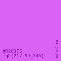 Цвет #D963F5 в цветовой модели RGB обозначается тремя октетами (217, 99, 245) в десятичном формате и #D963F5 в шестнадцатиричном (hex) формате, которые являются интенсивностью красного 217 (hex D9), интенсивность зелёного 99 (hex 63) и интенсивность синего 245 (hex F5).