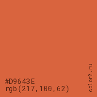 Цвет #D9643E в цветовой модели RGB обозначается тремя октетами (217, 100, 62) в десятичном формате и #D9643E в шестнадцатиричном (hex) формате, которые являются интенсивностью красного 217 (hex D9), интенсивность зелёного 100 (hex 64) и интенсивность синего 62 (hex 3E).