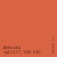 Цвет #D96444 в цветовой модели RGB обозначается тремя октетами (217, 100, 68) в десятичном формате и #D96444 в шестнадцатиричном (hex) формате, которые являются интенсивностью красного 217 (hex D9), интенсивность зелёного 100 (hex 64) и интенсивность синего 68 (hex 44).