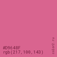 Цвет #D9648F в цветовой модели RGB обозначается тремя октетами (217, 100, 143) в десятичном формате и #D9648F в шестнадцатиричном (hex) формате, которые являются интенсивностью красного 217 (hex D9), интенсивность зелёного 100 (hex 64) и интенсивность синего 143 (hex 8F).
