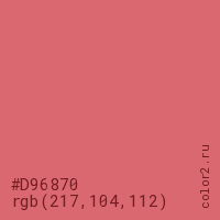 Цвет #D96870 в цветовой модели RGB обозначается тремя октетами (217, 104, 112) в десятичном формате и #D96870 в шестнадцатиричном (hex) формате, которые являются интенсивностью красного 217 (hex D9), интенсивность зелёного 104 (hex 68) и интенсивность синего 112 (hex 70).