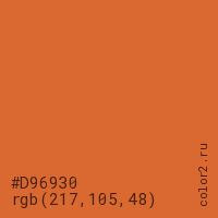 Цвет #D96930 в цветовой модели RGB обозначается тремя октетами (217, 105, 48) в десятичном формате и #D96930 в шестнадцатиричном (hex) формате, которые являются интенсивностью красного 217 (hex D9), интенсивность зелёного 105 (hex 69) и интенсивность синего 48 (hex 30).