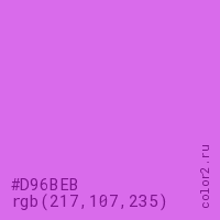 Цвет #D96BEB в цветовой модели RGB обозначается тремя октетами (217, 107, 235) в десятичном формате и #D96BEB в шестнадцатиричном (hex) формате, которые являются интенсивностью красного 217 (hex D9), интенсивность зелёного 107 (hex 6B) и интенсивность синего 235 (hex EB).