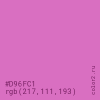 Цвет #D96FC1 в цветовой модели RGB обозначается тремя октетами (217, 111, 193) в десятичном формате и #D96FC1 в шестнадцатиричном (hex) формате, которые являются интенсивностью красного 217 (hex D9), интенсивность зелёного 111 (hex 6F) и интенсивность синего 193 (hex C1).