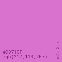 Цвет #D971CF в цветовой модели RGB обозначается тремя октетами (217, 113, 207) в десятичном формате и #D971CF в шестнадцатиричном (hex) формате, которые являются интенсивностью красного 217 (hex D9), интенсивность зелёного 113 (hex 71) и интенсивность синего 207 (hex CF).