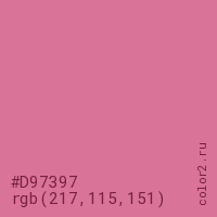 Цвет #D97397 в цветовой модели RGB обозначается тремя октетами (217, 115, 151) в десятичном формате и #D97397 в шестнадцатиричном (hex) формате, которые являются интенсивностью красного 217 (hex D9), интенсивность зелёного 115 (hex 73) и интенсивность синего 151 (hex 97).