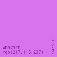 Цвет #D973ED в цветовой модели RGB обозначается тремя октетами (217, 115, 237) в десятичном формате и #D973ED в шестнадцатиричном (hex) формате, которые являются интенсивностью красного 217 (hex D9), интенсивность зелёного 115 (hex 73) и интенсивность синего 237 (hex ED).