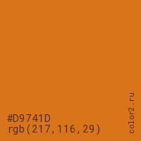 Цвет #D9741D в цветовой модели RGB обозначается тремя октетами (217, 116, 29) в десятичном формате и #D9741D в шестнадцатиричном (hex) формате, которые являются интенсивностью красного 217 (hex D9), интенсивность зелёного 116 (hex 74) и интенсивность синего 29 (hex 1D).