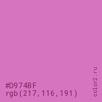 Цвет #D974BF в цветовой модели RGB обозначается тремя октетами (217, 116, 191) в десятичном формате и #D974BF в шестнадцатиричном (hex) формате, которые являются интенсивностью красного 217 (hex D9), интенсивность зелёного 116 (hex 74) и интенсивность синего 191 (hex BF).