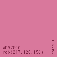 Цвет #D9789C в цветовой модели RGB обозначается тремя октетами (217, 120, 156) в десятичном формате и #D9789C в шестнадцатиричном (hex) формате, которые являются интенсивностью красного 217 (hex D9), интенсивность зелёного 120 (hex 78) и интенсивность синего 156 (hex 9C).