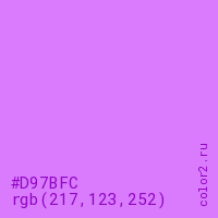 Цвет #D97BFC в цветовой модели RGB обозначается тремя октетами (217, 123, 252) в десятичном формате и #D97BFC в шестнадцатиричном (hex) формате, которые являются интенсивностью красного 217 (hex D9), интенсивность зелёного 123 (hex 7B) и интенсивность синего 252 (hex FC).
