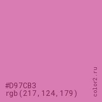 Цвет #D97CB3 в цветовой модели RGB обозначается тремя октетами (217, 124, 179) в десятичном формате и #D97CB3 в шестнадцатиричном (hex) формате, которые являются интенсивностью красного 217 (hex D9), интенсивность зелёного 124 (hex 7C) и интенсивность синего 179 (hex B3).