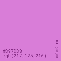Цвет #D97DD8 в цветовой модели RGB обозначается тремя октетами (217, 125, 216) в десятичном формате и #D97DD8 в шестнадцатиричном (hex) формате, которые являются интенсивностью красного 217 (hex D9), интенсивность зелёного 125 (hex 7D) и интенсивность синего 216 (hex D8).