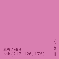 Цвет #D97EB0 в цветовой модели RGB обозначается тремя октетами (217, 126, 176) в десятичном формате и #D97EB0 в шестнадцатиричном (hex) формате, которые являются интенсивностью красного 217 (hex D9), интенсивность зелёного 126 (hex 7E) и интенсивность синего 176 (hex B0).