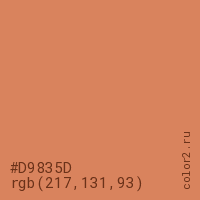 Цвет #D9835D в цветовой модели RGB обозначается тремя октетами (217, 131, 93) в десятичном формате и #D9835D в шестнадцатиричном (hex) формате, которые являются интенсивностью красного 217 (hex D9), интенсивность зелёного 131 (hex 83) и интенсивность синего 93 (hex 5D).