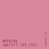 Цвет #D9879B в цветовой модели RGB обозначается тремя октетами (217, 135, 155) в десятичном формате и #D9879B в шестнадцатиричном (hex) формате, которые являются интенсивностью красного 217 (hex D9), интенсивность зелёного 135 (hex 87) и интенсивность синего 155 (hex 9B).