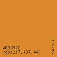 Цвет #D9892C в цветовой модели RGB обозначается тремя октетами (217, 137, 44) в десятичном формате и #D9892C в шестнадцатиричном (hex) формате, которые являются интенсивностью красного 217 (hex D9), интенсивность зелёного 137 (hex 89) и интенсивность синего 44 (hex 2C).