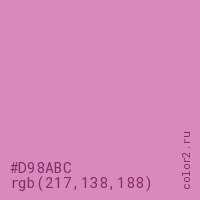 Цвет #D98ABC в цветовой модели RGB обозначается тремя октетами (217, 138, 188) в десятичном формате и #D98ABC в шестнадцатиричном (hex) формате, которые являются интенсивностью красного 217 (hex D9), интенсивность зелёного 138 (hex 8A) и интенсивность синего 188 (hex BC).