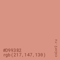 Цвет #D99382 в цветовой модели RGB обозначается тремя октетами (217, 147, 130) в десятичном формате и #D99382 в шестнадцатиричном (hex) формате, которые являются интенсивностью красного 217 (hex D9), интенсивность зелёного 147 (hex 93) и интенсивность синего 130 (hex 82).