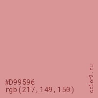 Цвет #D99596 в цветовой модели RGB обозначается тремя октетами (217, 149, 150) в десятичном формате и #D99596 в шестнадцатиричном (hex) формате, которые являются интенсивностью красного 217 (hex D9), интенсивность зелёного 149 (hex 95) и интенсивность синего 150 (hex 96).