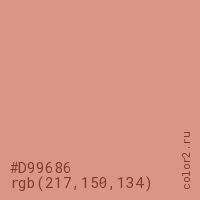Цвет #D99686 в цветовой модели RGB обозначается тремя октетами (217, 150, 134) в десятичном формате и #D99686 в шестнадцатиричном (hex) формате, которые являются интенсивностью красного 217 (hex D9), интенсивность зелёного 150 (hex 96) и интенсивность синего 134 (hex 86).