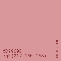 Цвет #D9969B в цветовой модели RGB обозначается тремя октетами (217, 150, 155) в десятичном формате и #D9969B в шестнадцатиричном (hex) формате, которые являются интенсивностью красного 217 (hex D9), интенсивность зелёного 150 (hex 96) и интенсивность синего 155 (hex 9B).