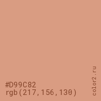 Цвет #D99C82 в цветовой модели RGB обозначается тремя октетами (217, 156, 130) в десятичном формате и #D99C82 в шестнадцатиричном (hex) формате, которые являются интенсивностью красного 217 (hex D9), интенсивность зелёного 156 (hex 9C) и интенсивность синего 130 (hex 82).